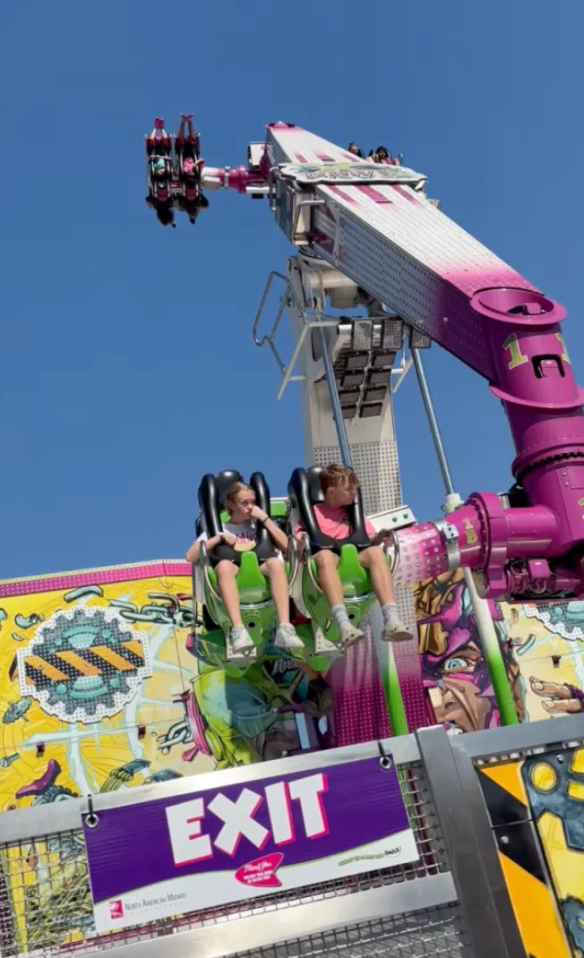 Ally Metzger recorded a cell phone video on Saturday afternoon at the Arkansas State Fair, showing her 11-year-old and 8-year-old kids stuck upside down on the X Drive Carnival Ride.